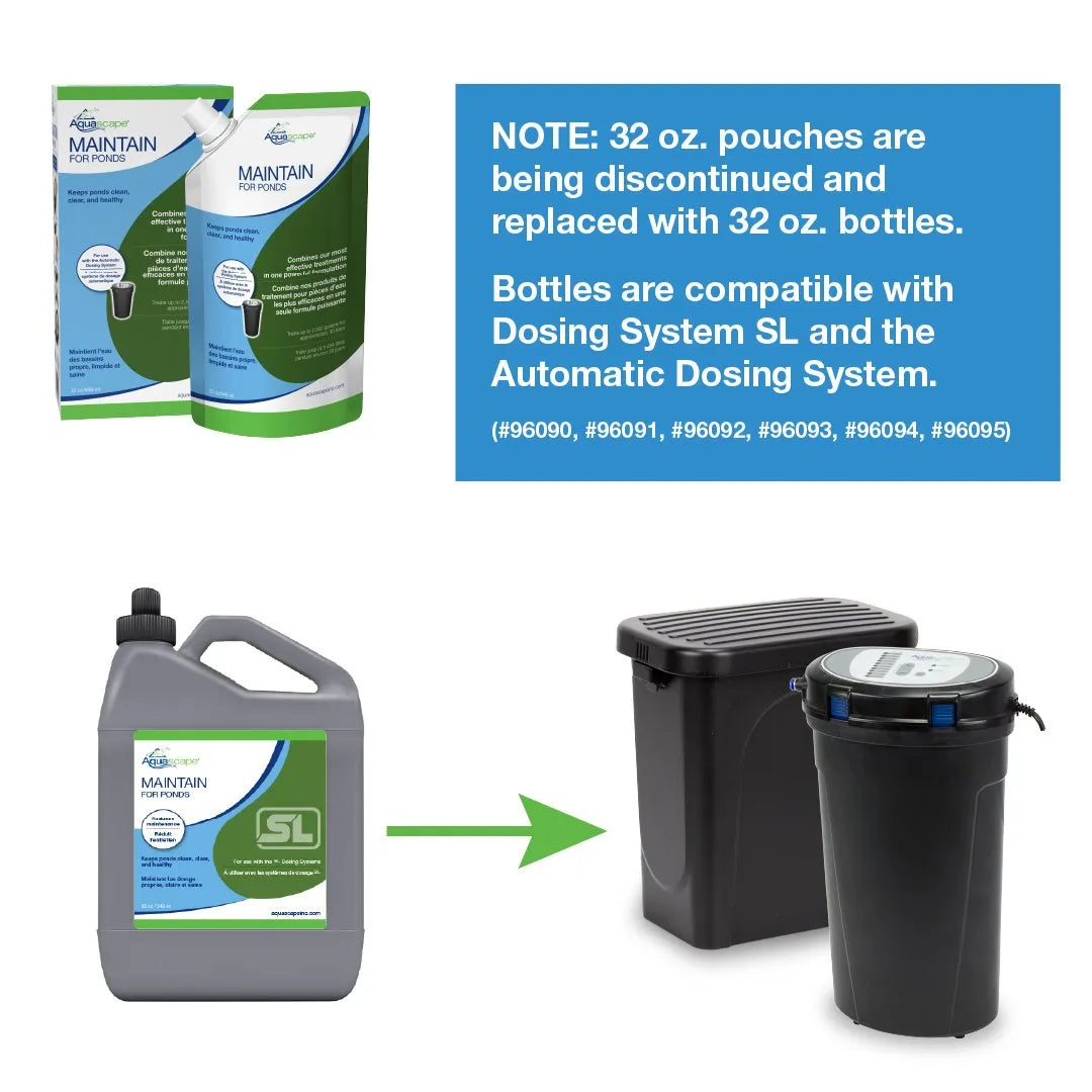 Aquascape Maintain Pond Water Treatment for the Automatic Dosing System is specifically formulated to maintain ponds containing fish and plants. The Maintain Treatment will help to significantly reduce maintenance and fish loss, allowing you to spend more time enjoying your pond and less time maintaining it. Aquascape Automatic Dosing System water treatments are specially formulated and automatically added consistently throughout the day, providing optimum water quality and clarity. Each bag of treatment will treat a 2,000 gallon pond for up to 30 days. Aquascape is passionate about the products we produce, providing unique products, designs, and features that stand above the competition.